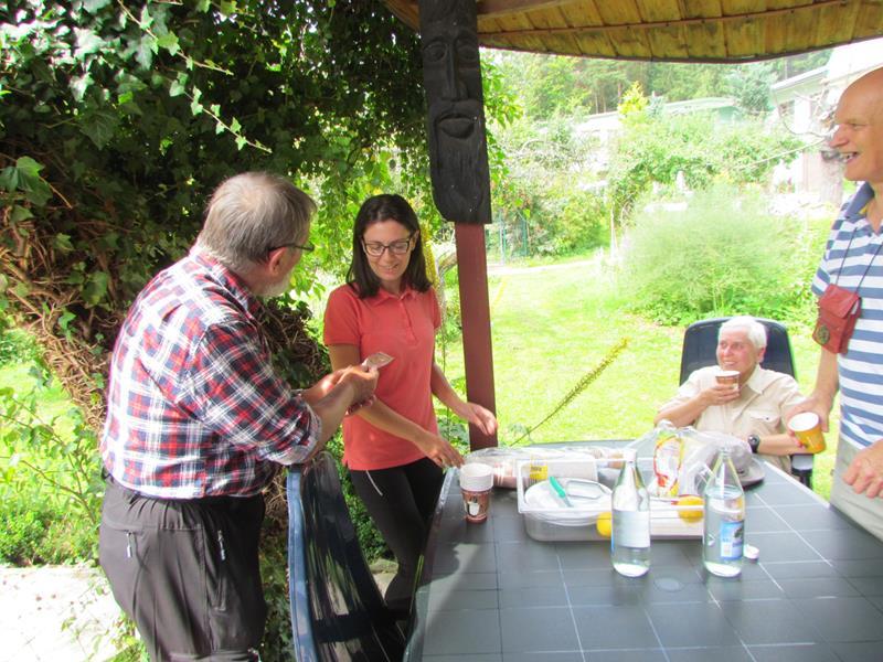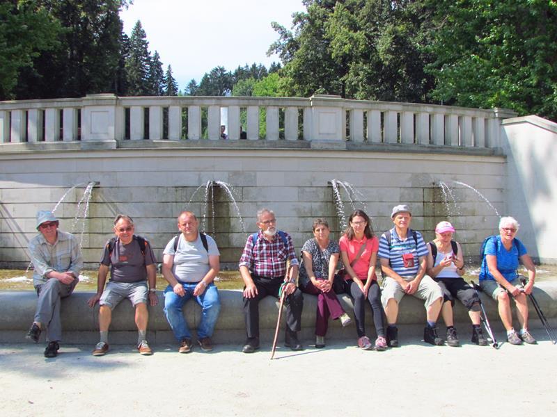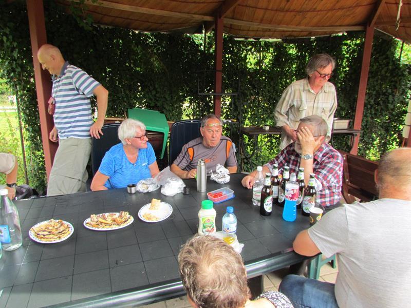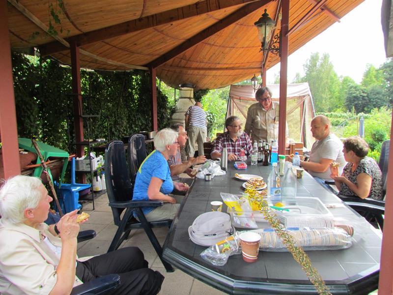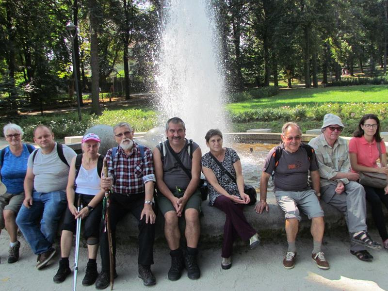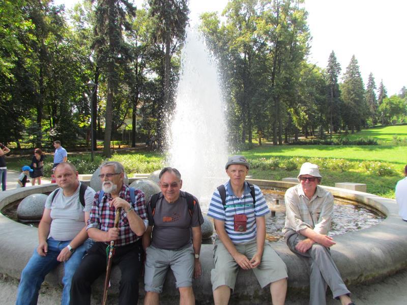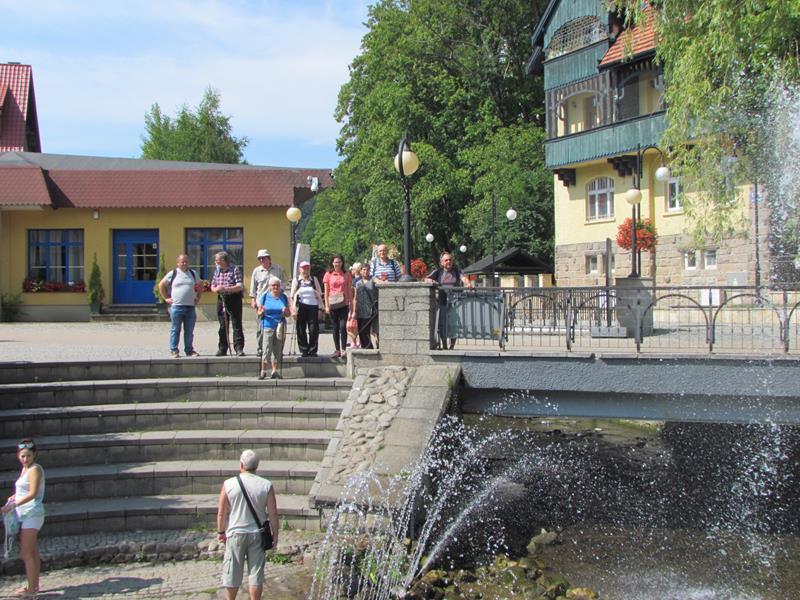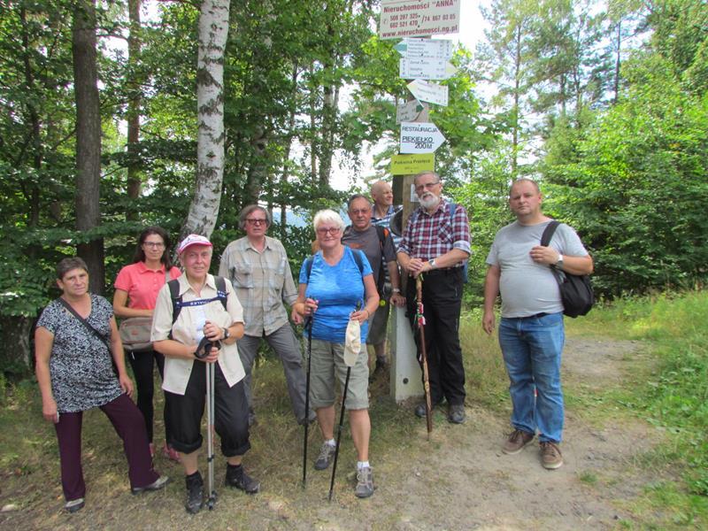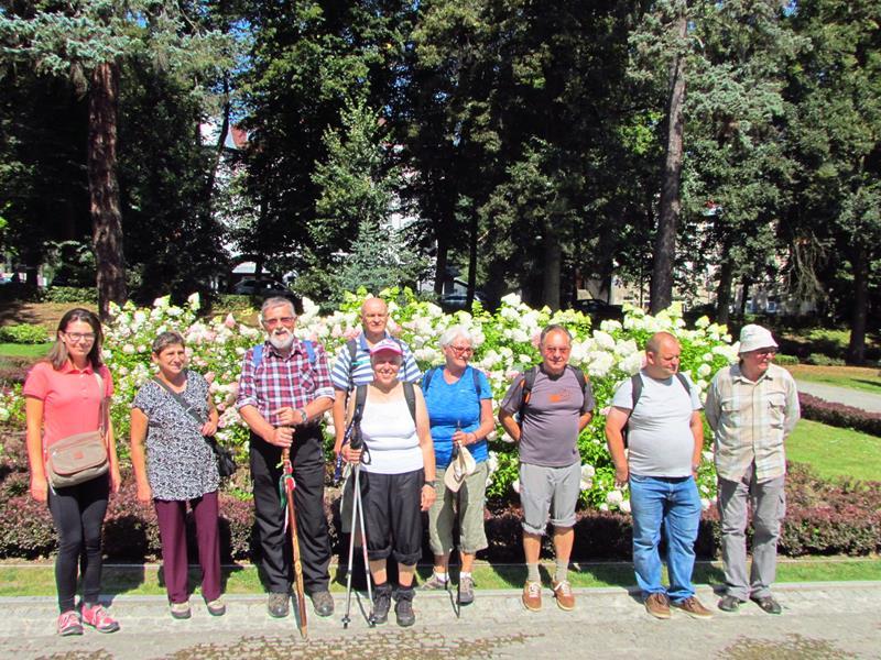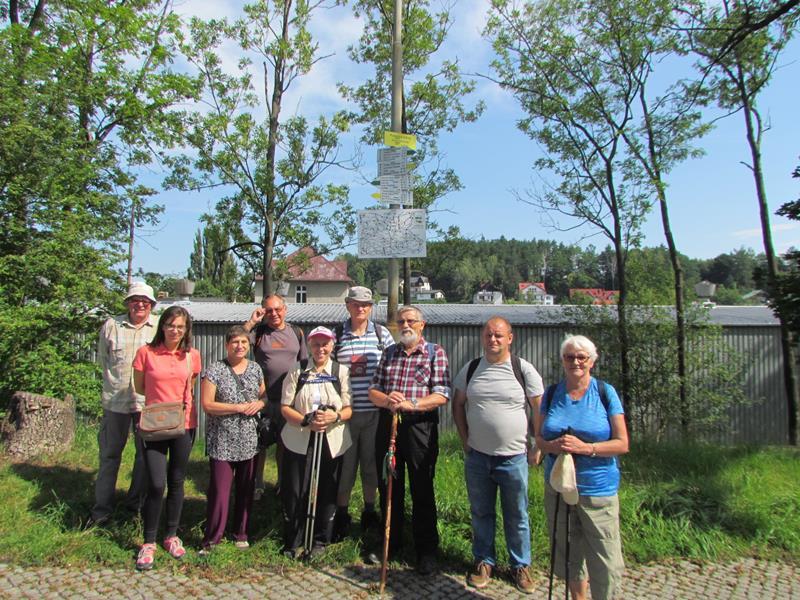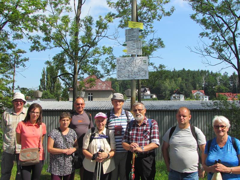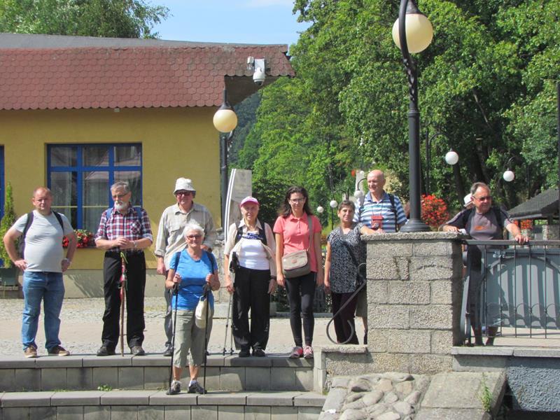 Przywitania z kwiatami i orkiestrą na stacji kolejowej w Polanicy-Zdroju oczywiście nie było, ale komitet powitalny i owszem. Na przyjeżdżających szynobusem z Nowej Rudy czekali uczestnicy ze Słupca i z Polanicy-Zdroju. Rajd (aczkolwiek niepewnie) poprowadziła sprawczyni imprezy. Na początek nietypowymi ścieżkami przez Park Zdrojowy, między szachami i hortensjami. Potem odpoczynek przy fontannach i dalej w górę, mijając po prawej szpital. Dalej w kierunku Piekielnej Przełęczy i wreszcie do domu naszych miłych gospodarzy. Tu już czekało na nas ognisko, ciasta, poczęstunki i wiele barwnych opowieści. Tu prawdziwy podziw dla kol. Zbigniewa, który własnym rękami zbudował całe to królestwo. Po posiłu kol. Czesław Dominas przeprowadził konkurs „coś na literę”.